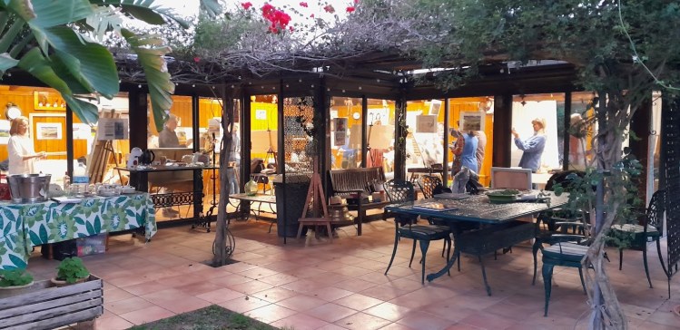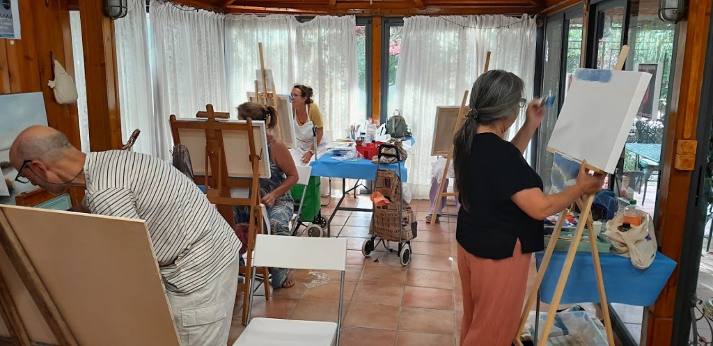 Nuestros cursos de pintura se realizan en una cabaña de madera rodeada de naturaleza, con amplios ventanales que ofrecen vistas a un jardín lleno de flores, árboles y una piscina. Cada alumno disfruta de un espacio de trabajo cómodo e iluminado, ideal para dejar fluir la creatividad en un ambiente tranquilo. Las clases son una experiencia única, combinando la inspiración del entorno con el aprendizaje compartido entre profesores y estudiantes.
